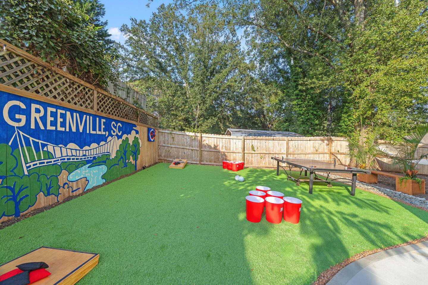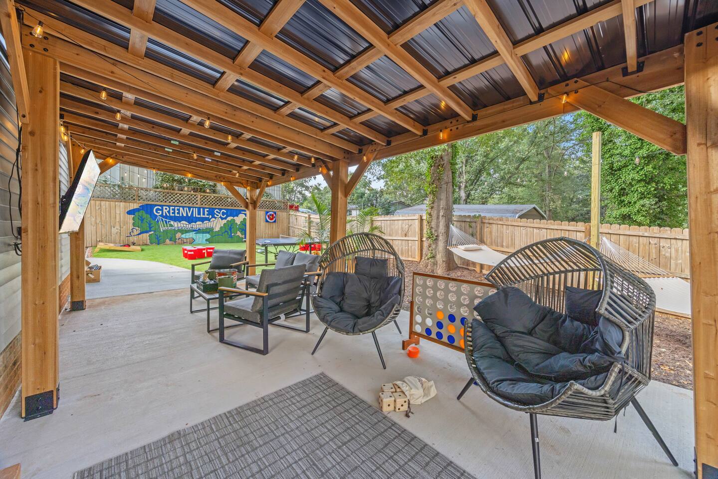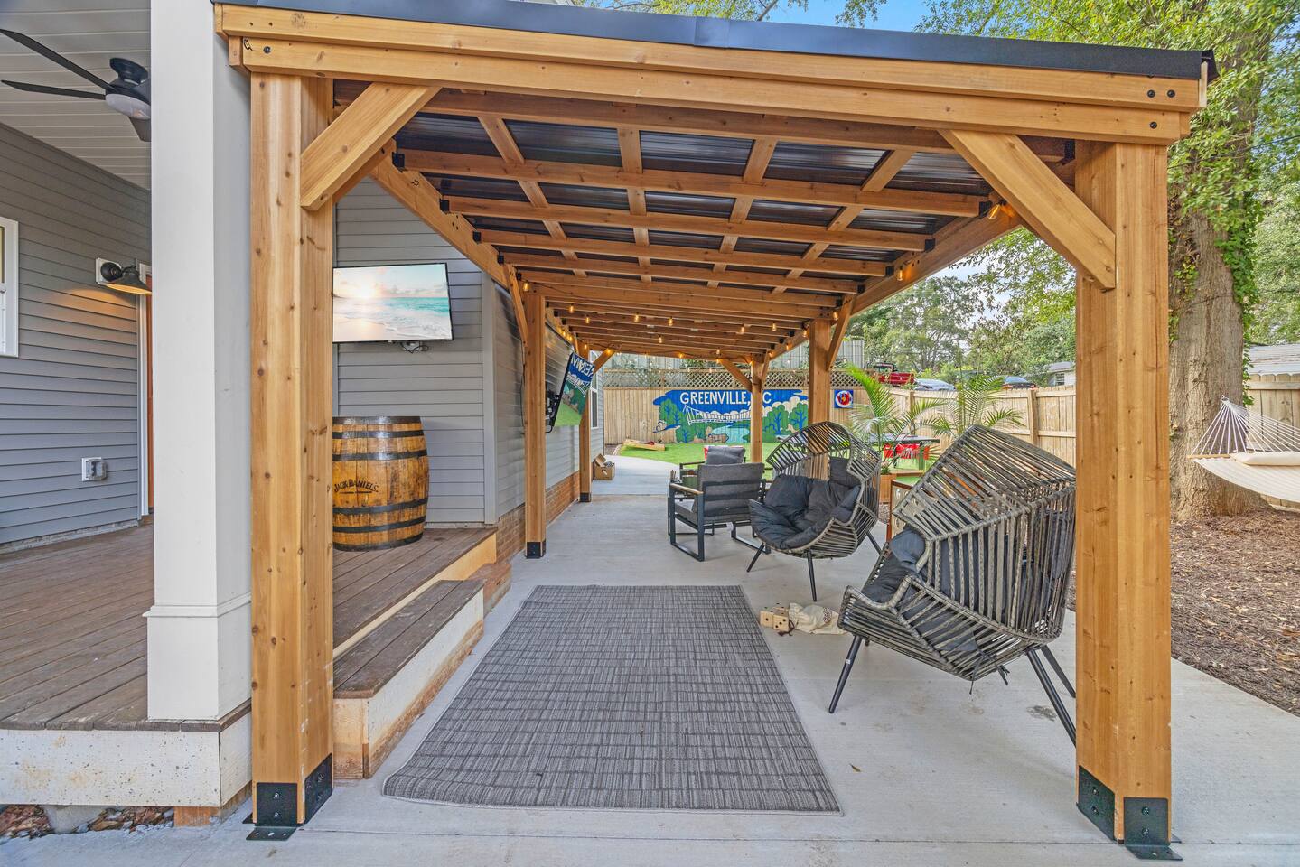 Welcome to Reserve 101 — a small-batch Southern stay just minutes from downtown Greenville. This 3BR/2BA boutique retreat features a private hot tub, covered patio, outdoor TVs, hammocks, and a full lineup of games including Skeeball, air hockey, arcade classics, and ping pong. Inside, enjoy curated gathering spaces, Roku TVs, and a warm, bourbon-inspired design. Crafted for rest, connection, and a little friendly competition — this is your Greenville reset, poured neat.