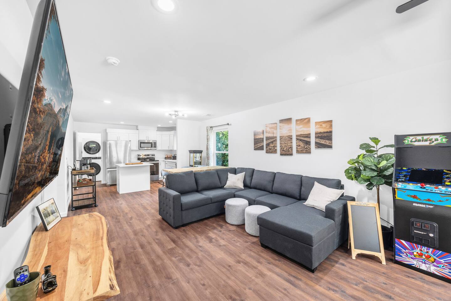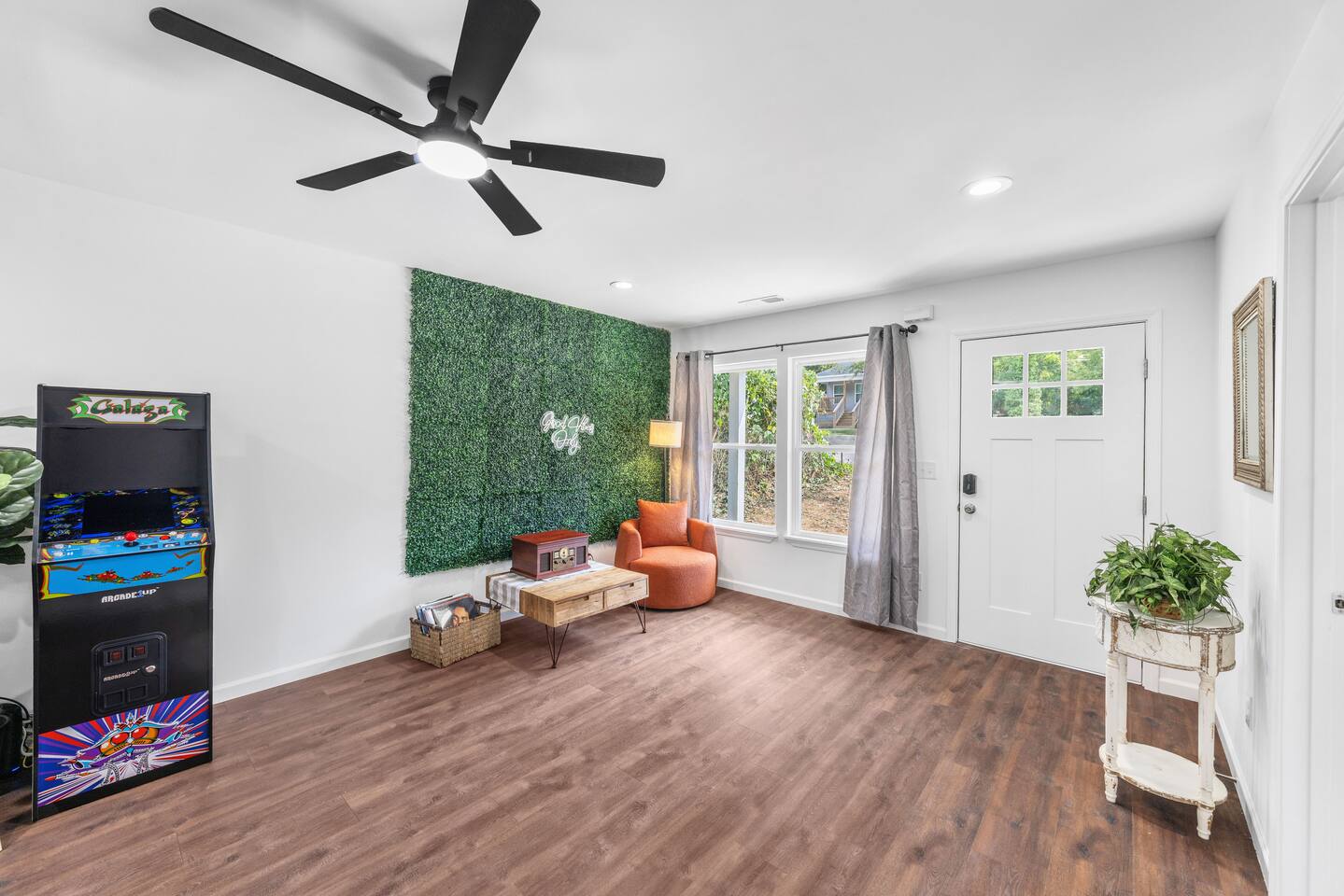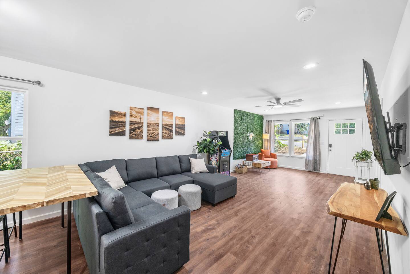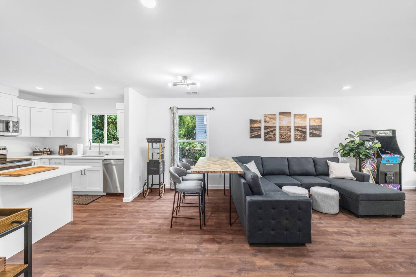 Guests have full private access to the entire home, including all indoor and outdoor spaces. You’ll enjoy: 3 fully furnished bedrooms + 2 full bathrooms Living room with sleeper sofa and Roku Smart TV Full kitchen, stocked with essentials + popcorn machine + BYOB cocktail bar Stand-up arcade + vinyl record station Laundry area with washer and dryer Fully fenced backyard with fire pit and café lights Covered front porch and back deck Free parking in the driveway (2 dedicated spaces, room for more) You’ll check in via smart lock — your unique code will be sent before arrival. No shared spaces or on-site hosts — the entire experience is yours to enjoy.